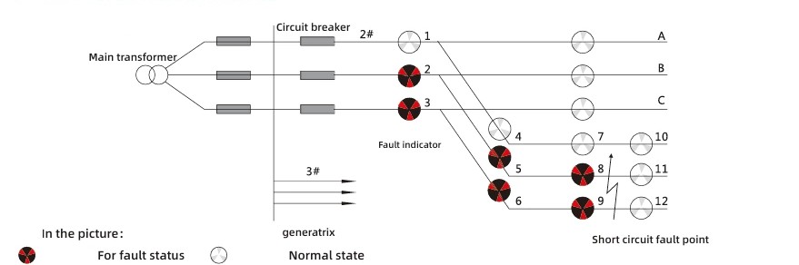 Lähtudes lühisrikete omadustest, on tegevuskriteeriumiks voolu järsk muutus, millega kaasneb kaitseseadme voolukatkestus. Vea indikatsiooni diagrammi tõlgendusloogika on järgmine: kui liini 2 faasi A näidikud 2, 5 ja 8 ning liini 2 faasi C näidikud 3, 6 ja 9 muutuvad punaseks, näidikud 11 ja 12 jäävad valgeks, siis saab tuvastada, et selles väljuva liini punktis on tekkinud lühisrike.